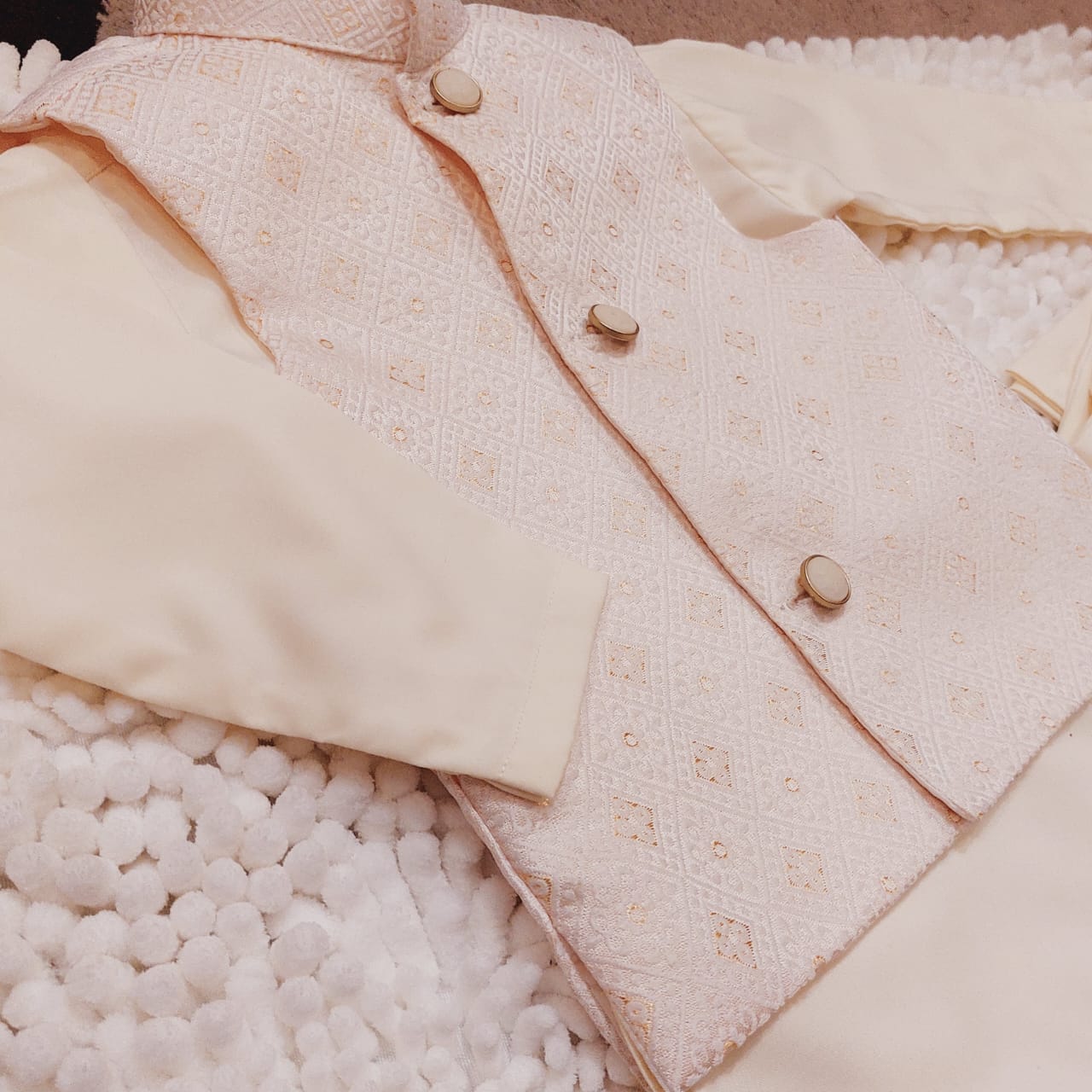 Get your little one ready for any formal occasion with our Boys Vanilla Waistcoat set. The package includes a Kurta, Trouser, and Waistcoat made from high-quality fabrics for comfort and durability. The waistcoat features fancy buttons and a patch pocket, while the kurta and trousers have a sleek, straight design. Perfect for any event, this 3-piece outfit will have your child looking sharp and stylish.
