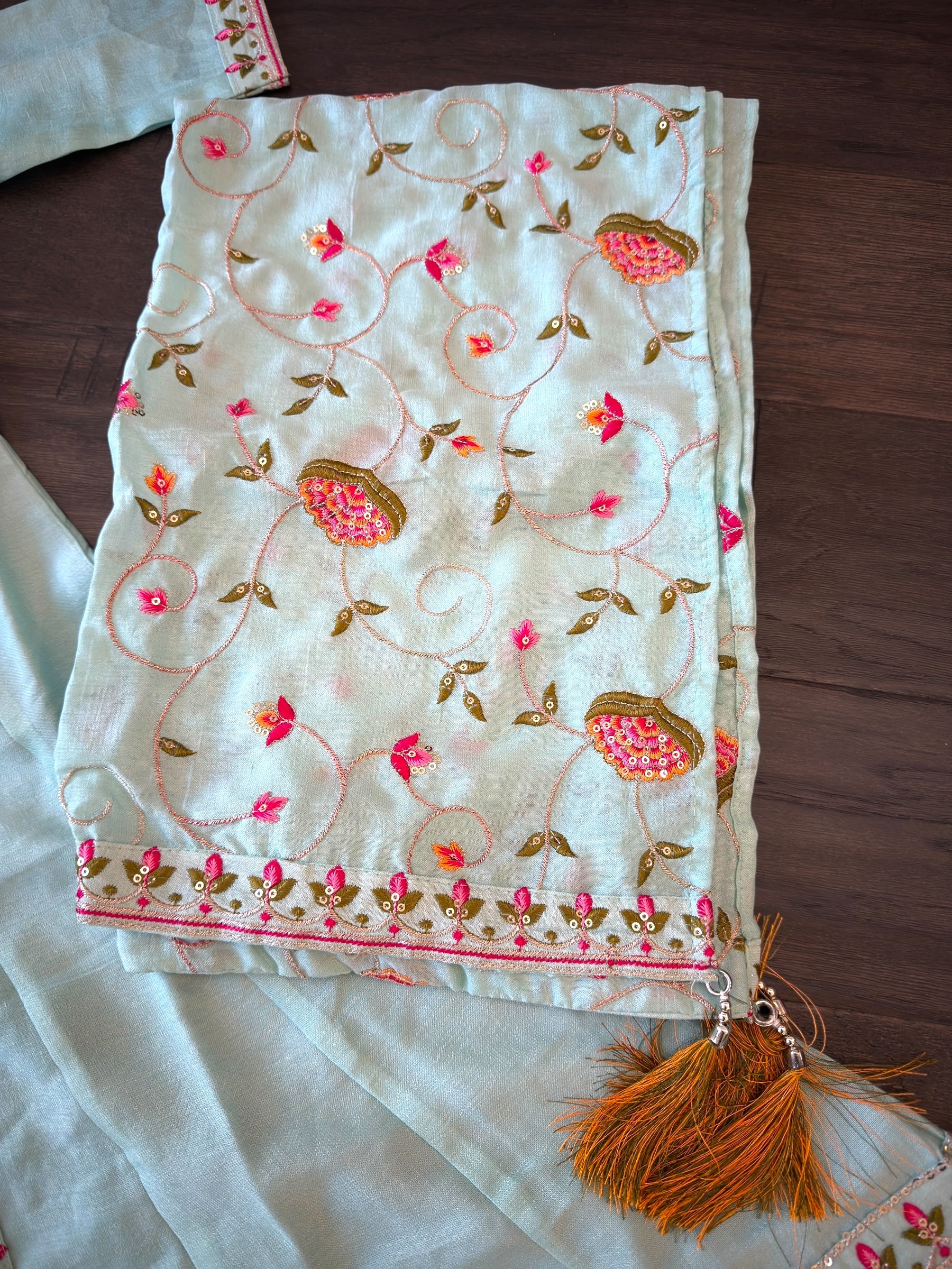 Get ready to turn heads with our Girls Light Blue Anarkali! This stunning set includes an anarkali, churidar, and dupatta, all made from luxurious silk fabric. The amazing embroidery work adds a touch of elegance to this Fall Festive collection. Get the perfect blend of style and comfort with our statement-making Anarkali.