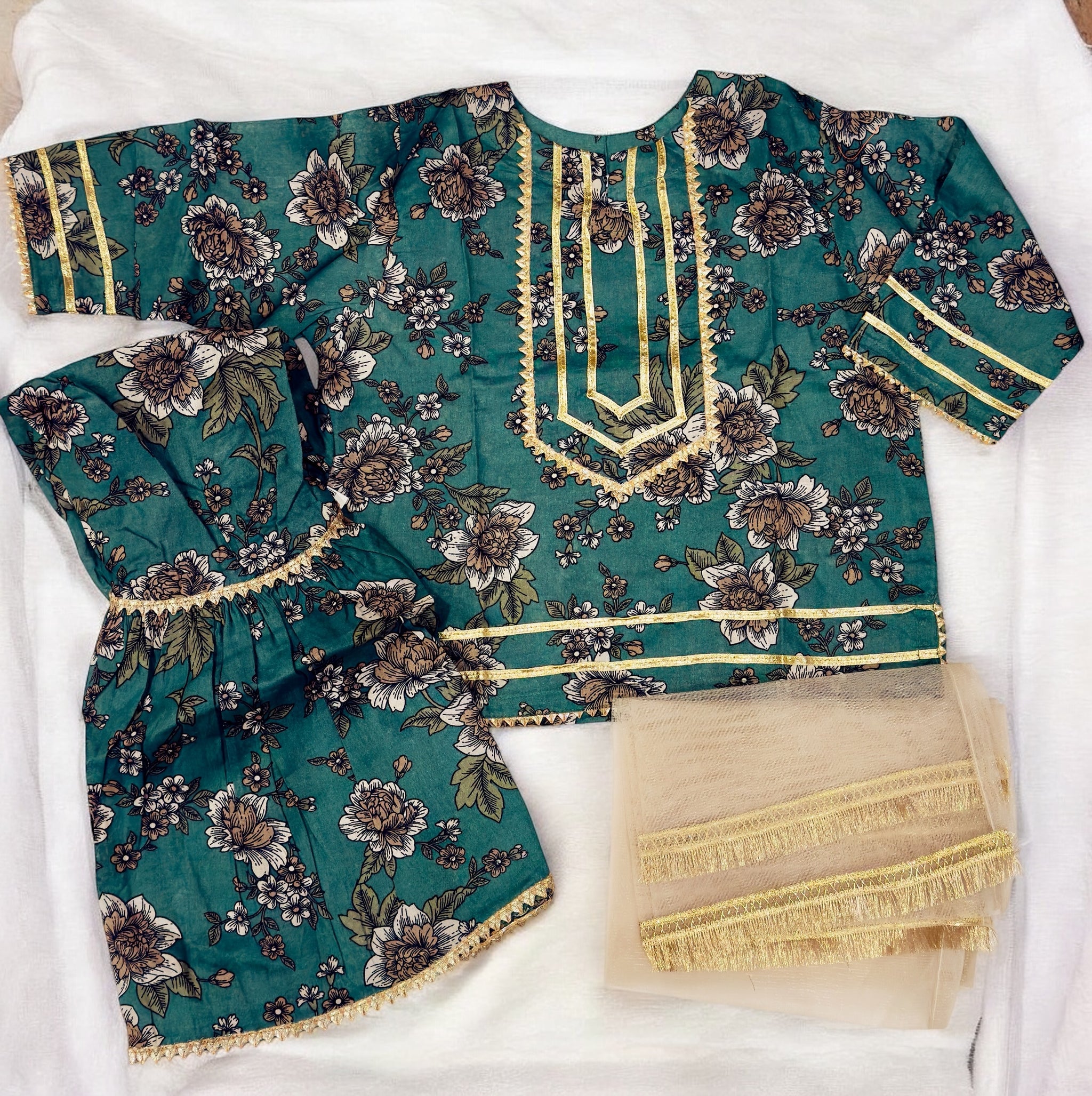 Twirl and shine in this enchanting green gharara suit! Adorned with delicate gold handwork and pretty prints, this three-piece ensemble includes a comfortable top, flowy gharara pants, and matching dupatta. Made from soft lawn fabric that keeps your little princess cool while she dazzles at special occasions. Perfect for making magical memories!