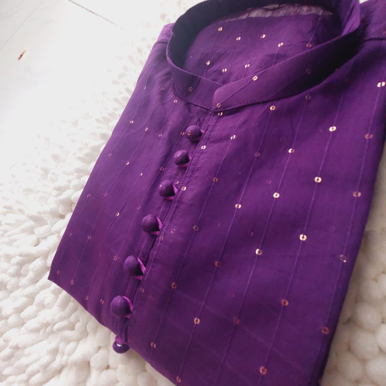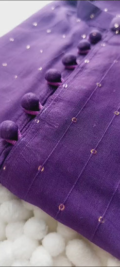 Upgrade your little one's style game with our Purple Sequence Kurta w/ Trouser set. Made from premium cotton, this set features intricate sequence work and full sleeves, perfect for the festive season. Elevate their look with this stylish and comfortable kurta and white trouser combo.