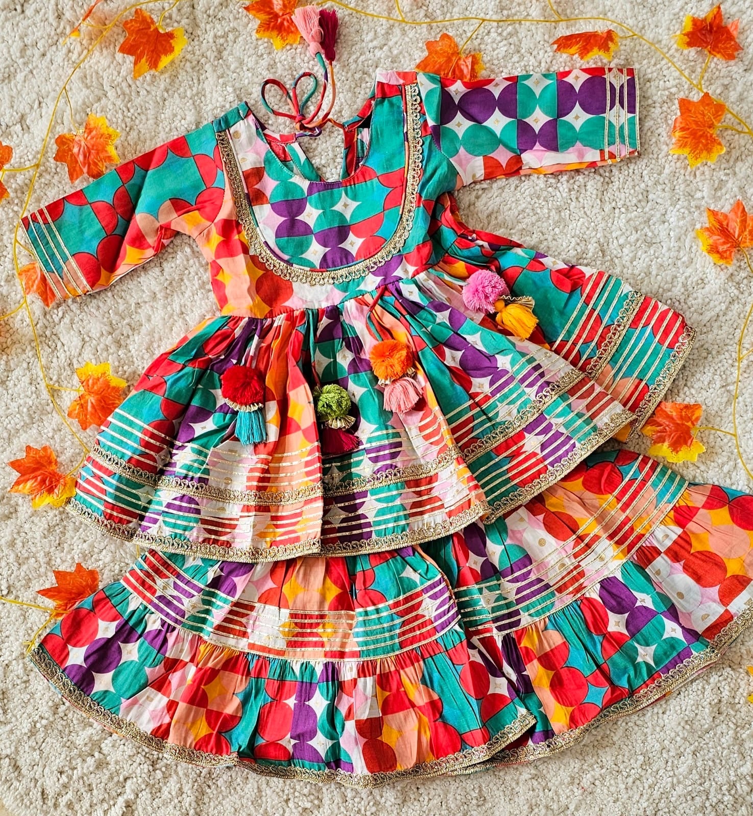 Celebrate in style with the Rangeela Sharara—a show-stopping festive ensemble designed for the girl who loves to stand out. This playful two-piece features a peplum top adorned with charming pom-pom tassels that catch the light and turn heads at every celebration. Crafted from soft, breathable muslin, the sharara silhouette flows beautifully while keeping comfort front and center. Perfect for weddings, festivals, and special occasions, this rich-looking set delivers luxury vibes without the fuss. Let her twirl, dance, and shine in this festive favorite.